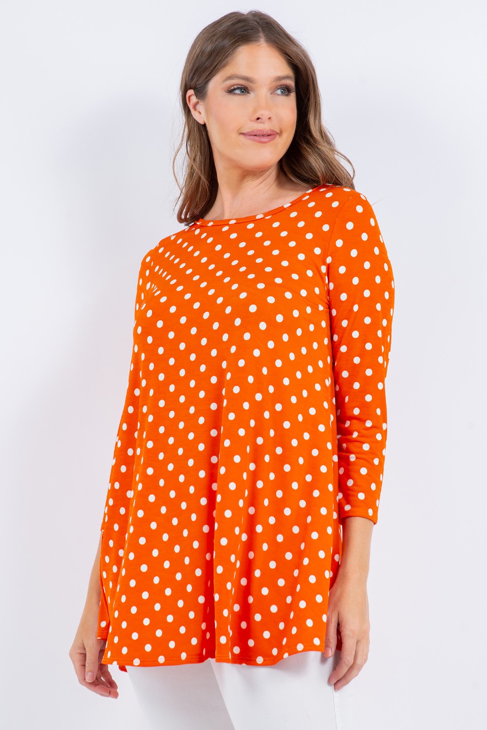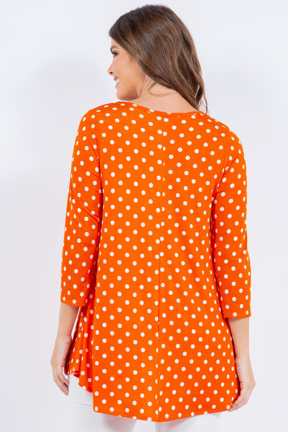 Polka Dot 3/4 Tunic TopModel SizeModel Is Ht:5'8 Bust:34 Waist:26 Hips:37And Wears Size SmallComfy Top To Wear Every Day!Fabric Contents92% Polyester8% SpandexMade In USA