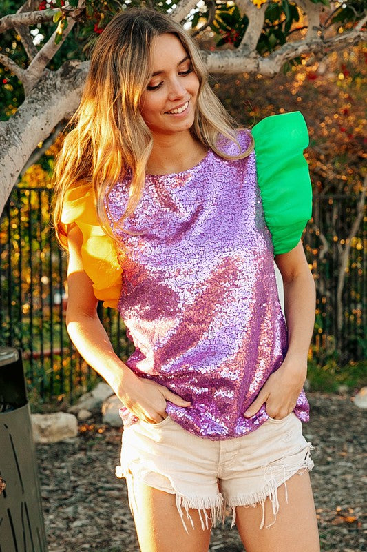 Mardi Gras Color Block Sequin Top Organza Sleeve