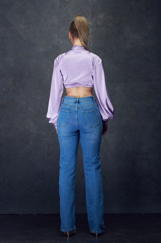 Soft Satin Cropped Top With Voluminous Cuffed Sleeves And Elastic Back Band As A Pull Over Top.Model Wears Size Small.Fabric ContentsSatin
