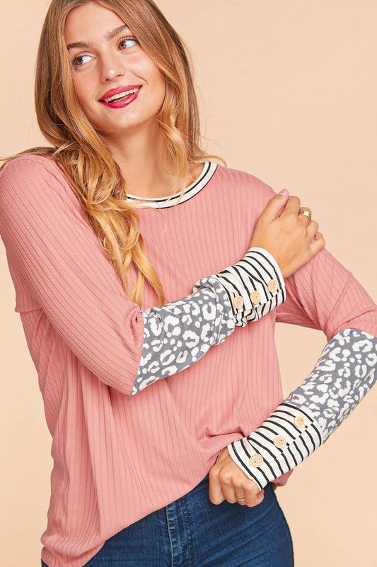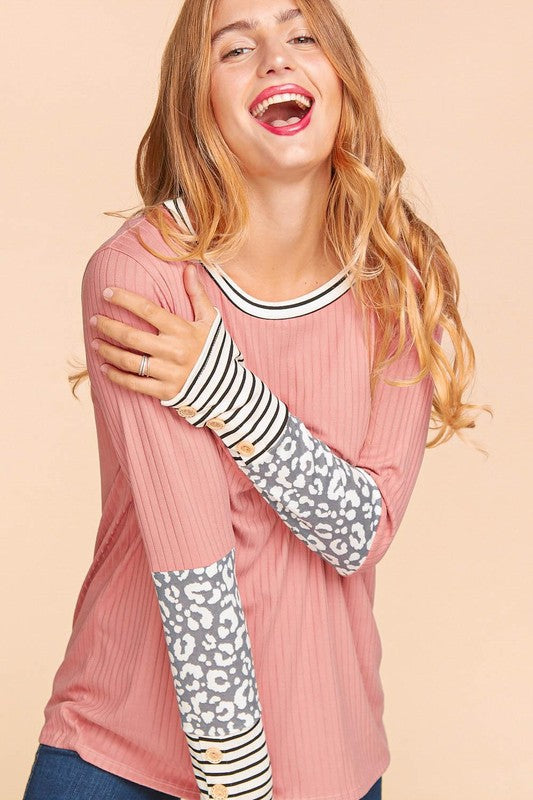 Round Neck Rib Leopard Animal Print Stripe Color Block Long Sleeve With Button Detail Knit TopFabric Contents95% Polyester 5% Spandex