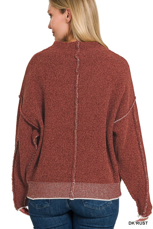 Dark Rust Oversized Mock Neck Raw Seam Chenille Sweater