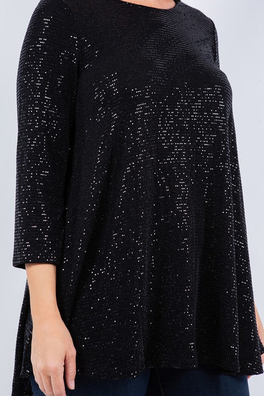 Shimmer Threaded 3/4 Tunic Top Model SizeModel Is Ht:5'8 Bust:34 Waist:26 Hips:37And Wears Size SmallComfy Top To Wear Every Day!Fabric Contents86% Nylon9% Mtl5% SpandexMade In USA