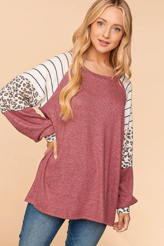 Two Tone Soft Brushed Hacci Stripe Leopard Animal Print Raglan Color Block Bubble Long Sleeve Round Neck Knit Top Fabric Contents 73% Rayon 22% Polyester 5% Spandex