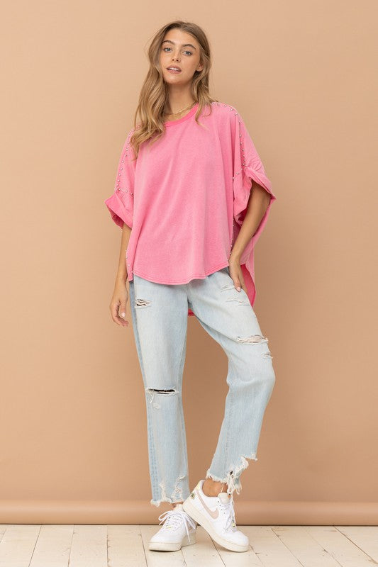 Garment Washed Roll Up Slv Studded Over Sized High Low T Shirt