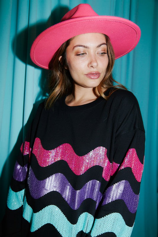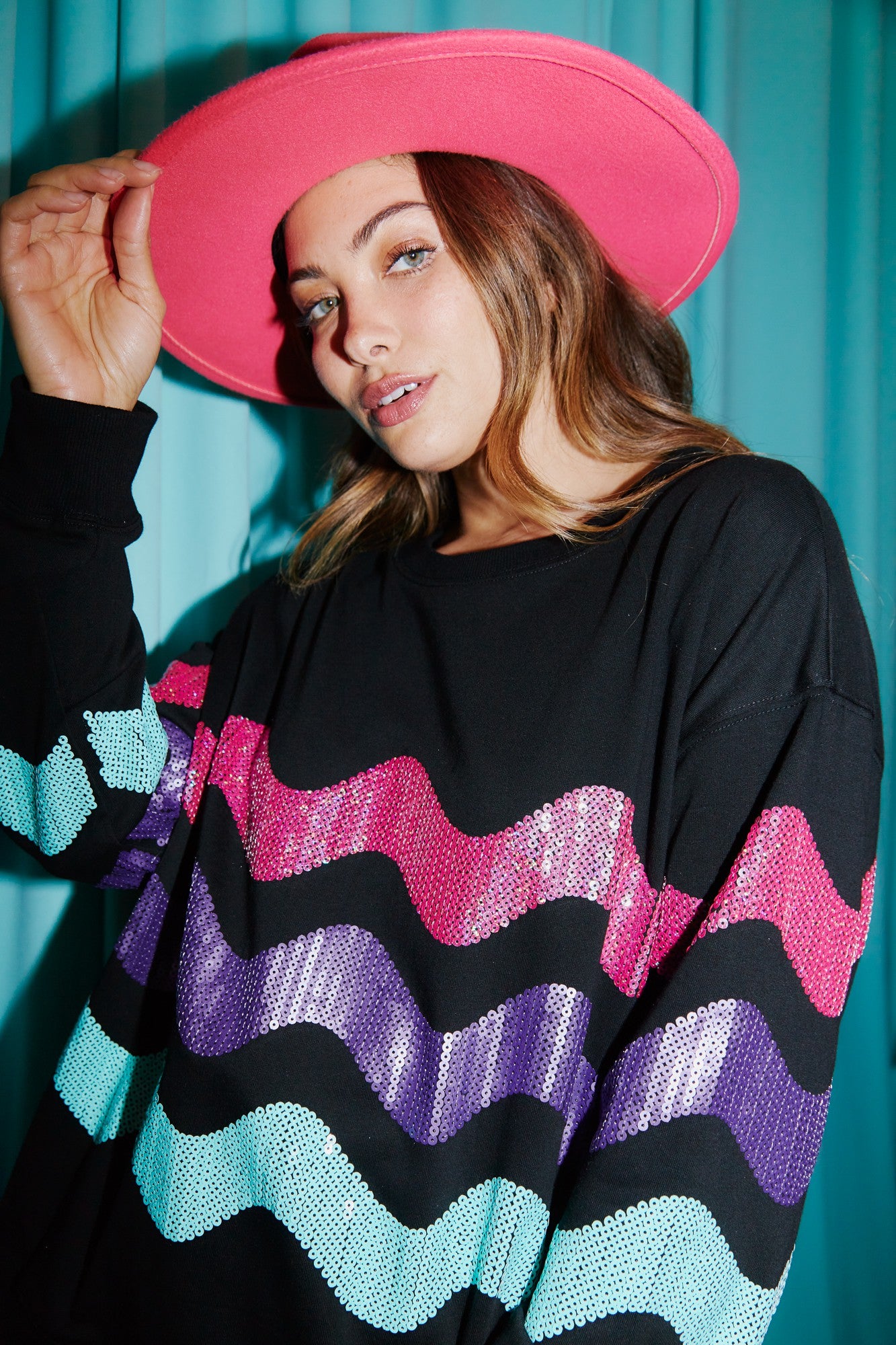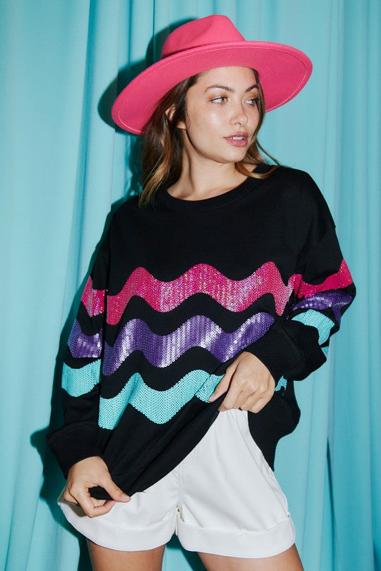 French Terry Loose Fit Long Sleeve Sweatshirt- Tri-Color Sequin Waves- Round Neck- Long SleeveFabric ContentsSelf: 60% Cotton 40% PolyesterRib: 95% Cotton 5% Spandex