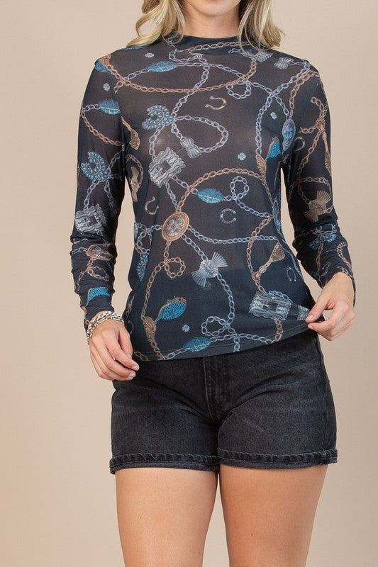 - Western Luck Jewel Print On Mesh Fabric- Mock Neck- Fall, Inner Top- Long Sleeves - Casual, Party Friendly Inner Top- Made In USA- Model: 5'10" 32-24-37Fabric Contents95% Poly, 5% Spandex
