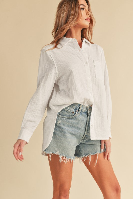 Presenting Our Plush Cotton Button-Down Nattie Shirt, A Modern Update To The Classic Style. Embrace The Oversized, Slouchy Silhouette For A Contemporary Twist. Complete With A Bust Patch Pocket Detail, Rounded Bottom Hem, And Exaggerated Side Slits, This Shirt Exudes Both Comfort And Chic Sophistication. Perfect For Effortlessly Elevating Your Everyday Look.