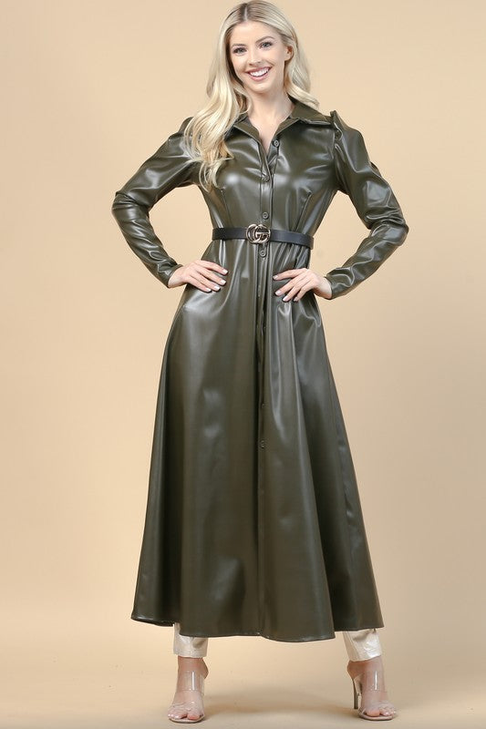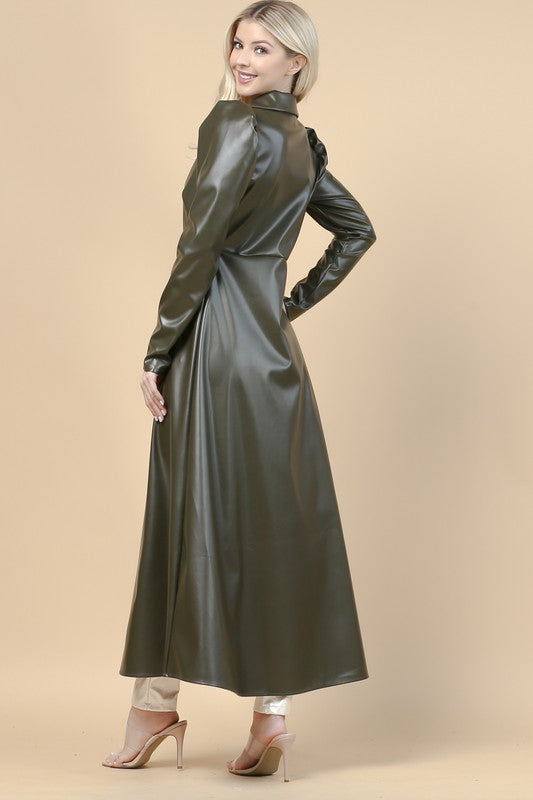 Olive Faux Leather Duster Long sleeves Jacket Dress Top