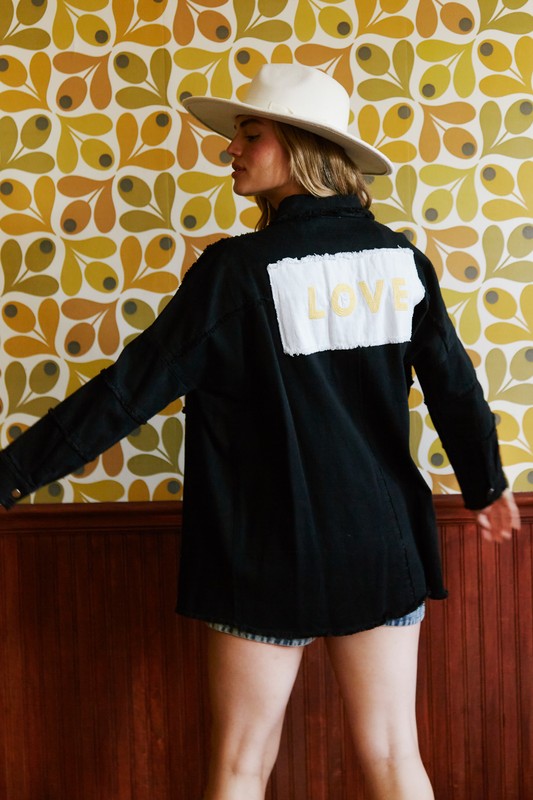 Love Patch Jacket-Collared-Back Patch Detail-Long Tiered Sleeves-Button Down -Pockets-Frayed Seam And Hem