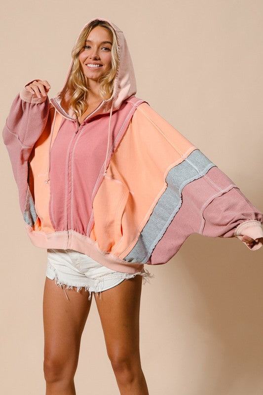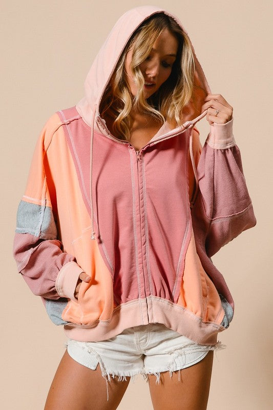 Raw Edge Color Block Vintage Washed French Terry Zip Up Hoodie