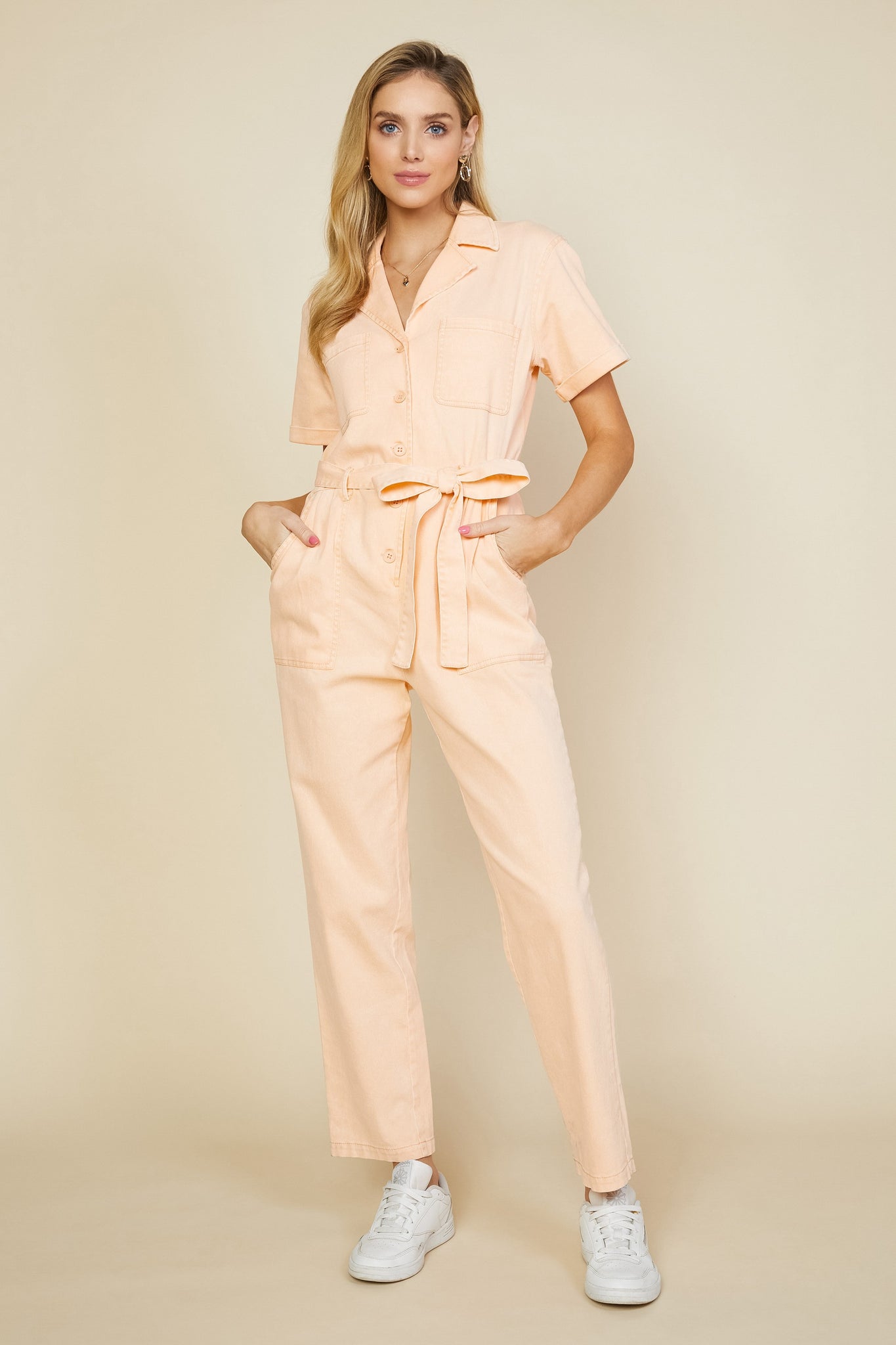 Skies Are Blue | Short Sleeve Washed Utility Jumpsuit With Tie BeltModel Is: Height: 5'8 1/2 Bust: 32" Waist: 24" Hip: 34 | Model Wears Size Small.